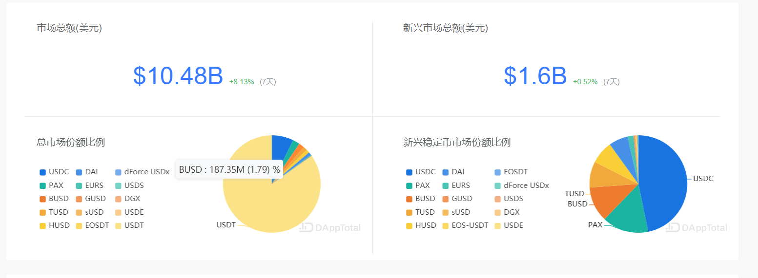 根据 DAppTotal 数据显示,截至 5 月 13 日,稳定币市场总额为 104.8 亿美元。在总的稳定币市场份额中,USDT 发行量为 88.8 亿美元,占比 84.76%。新兴稳定币(除去 USDT 的稳定币)中 BUSD 1.87 亿,占比 11.69%,排名第三。