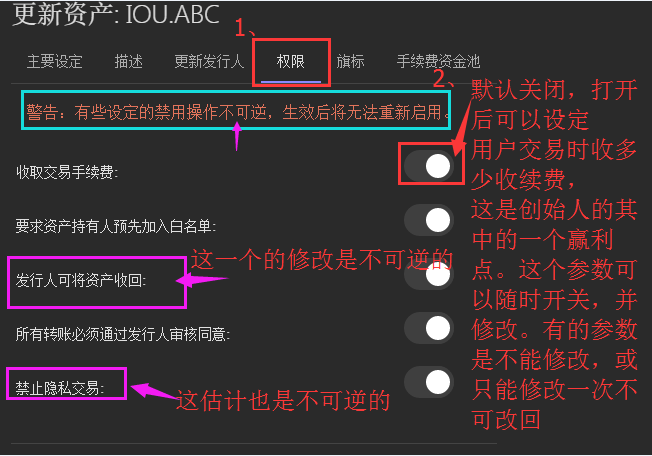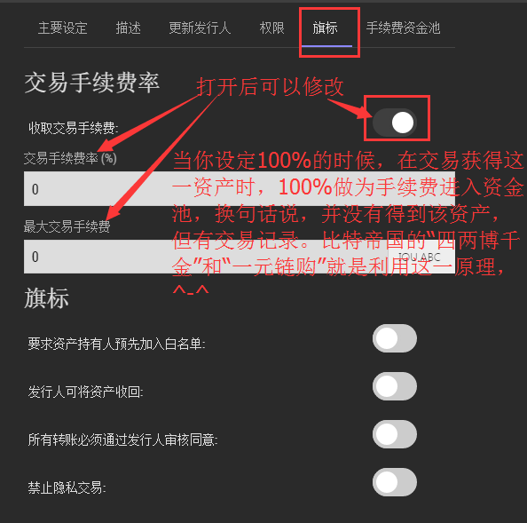 严重注意:第一次创建后,设为关闭的话,是不然在打开的。但如果你设为打开,以后可以打开在关闭。(目前主要测试了“收取交易手续费”),如果不是很了解的情况了创建的时候以默认为主。(白球在右边为打开)