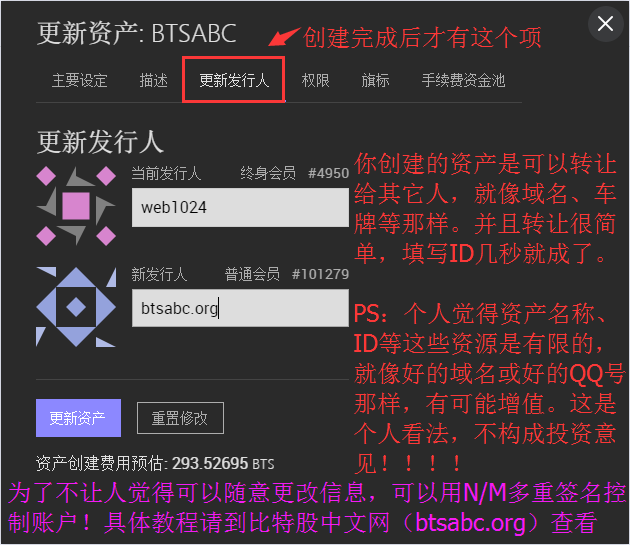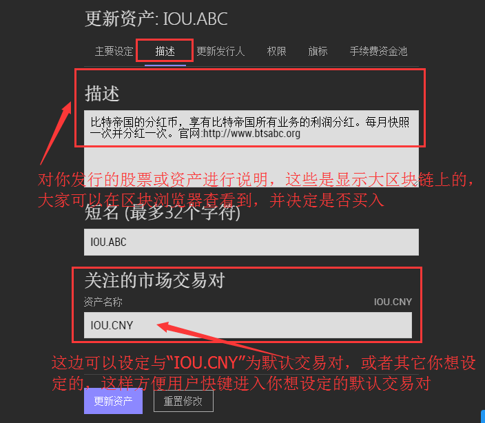 <2>资产最少三位字母,不能带数字,可以带点“.”(提前拥有"."前面的资产名称,比如比特帝国拥入三字母“IOU”,则可以创建“IOU.XXX”.其他人则不行,这样可以建立一个品牌)