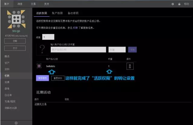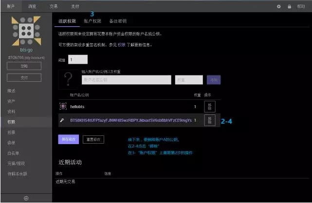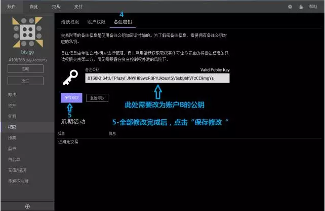 3.“活跃权限”、“账户权限”的转让只需要知道B的账户名,“备注密钥”的转让需要知道B的公钥。