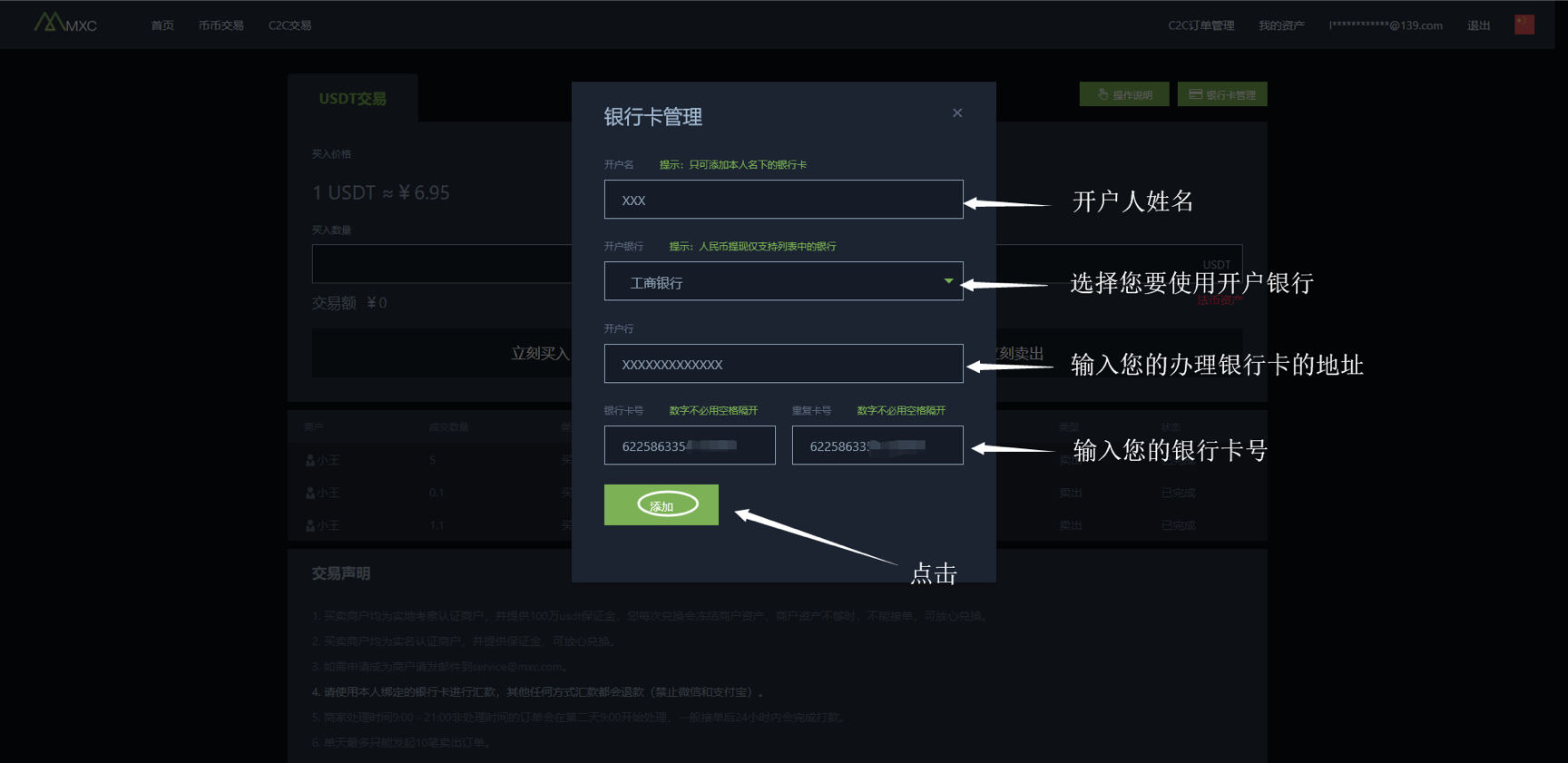 五、 添加银行卡:请输入您的银行卡开户人姓名—请选择您要使用开户银行—请您输入您的办理银行的地址—请输入您的银行卡号,并重复输入一次您的银行卡号—最后点击添加。