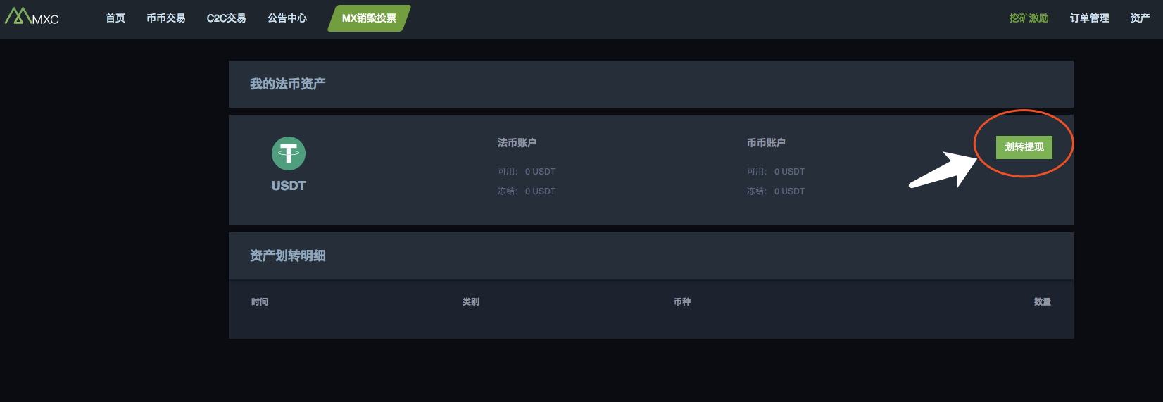 七、 资金划转。当您购买USDT完成后,想要使用USDT来购买其他数字货币时(例如:比特币BTC,以太坊ETH,抹茶MX),需要将您购得的USDT从“法币账户”划转到“币币账户”,划转完成后您才能在“币币交易”页面进行交易。具体方法如下: