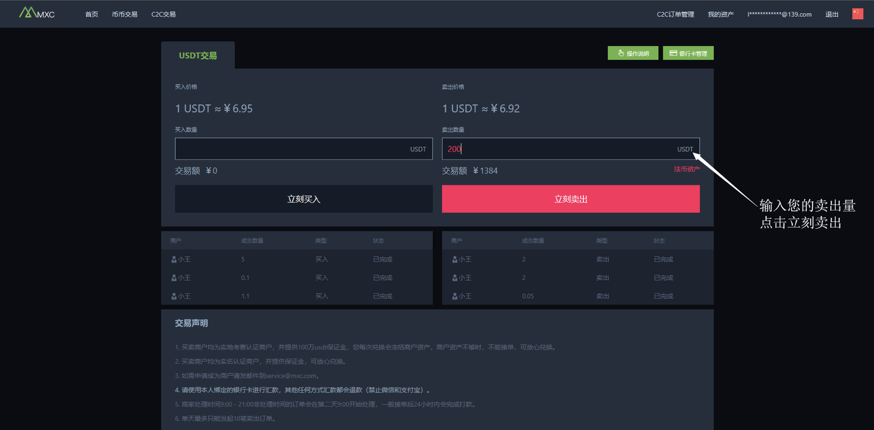 4、 请您此点击左上角的C2C交易后,请在USDT交易输入您的卖出数量,然后点击立刻卖出,完成卖出。