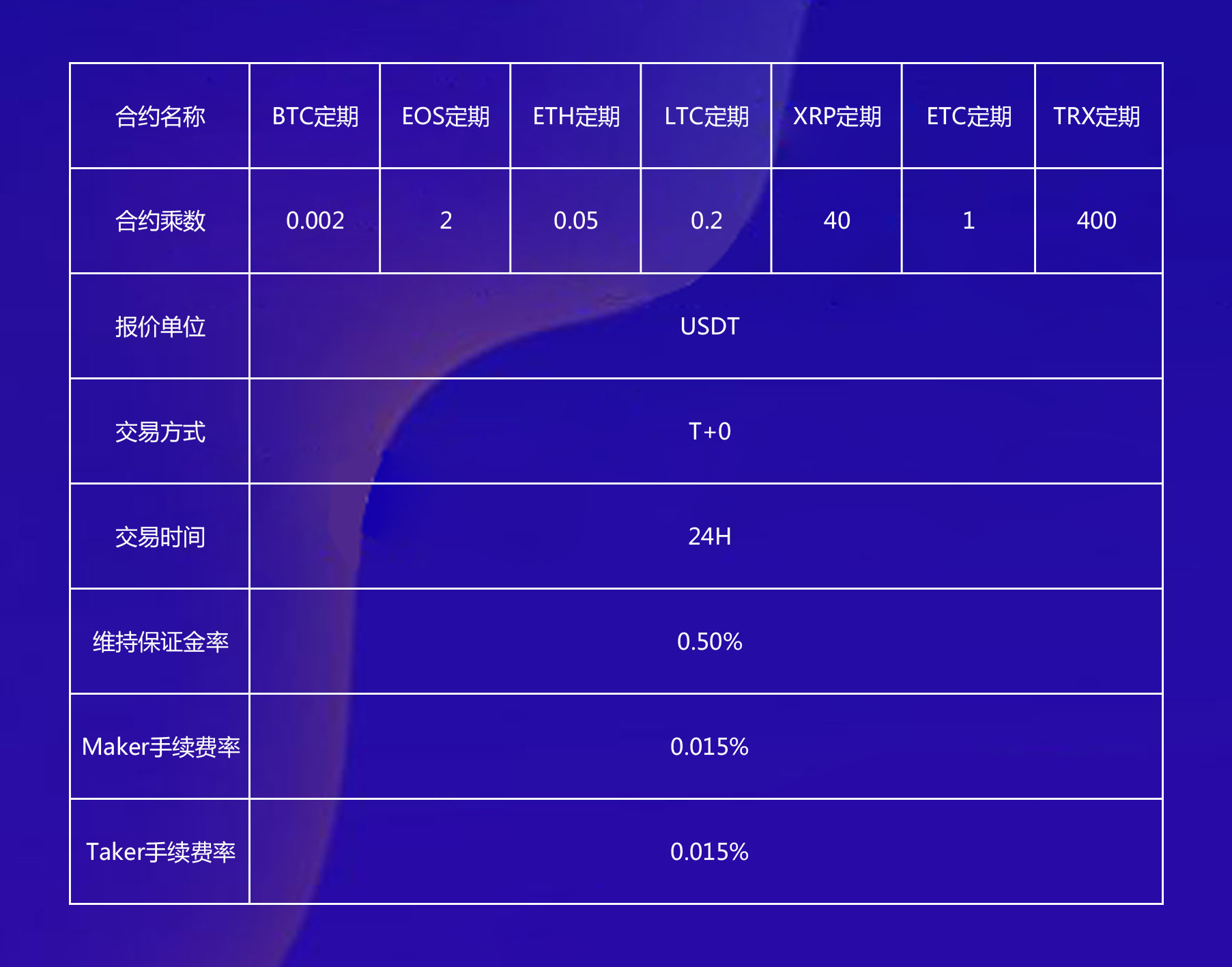 定期合约是标的物为数字货币、全程USDT计价结算、定期交割的数字货币合约。为方便交易,定期合约将使用和USDT合约相同的乘数。
