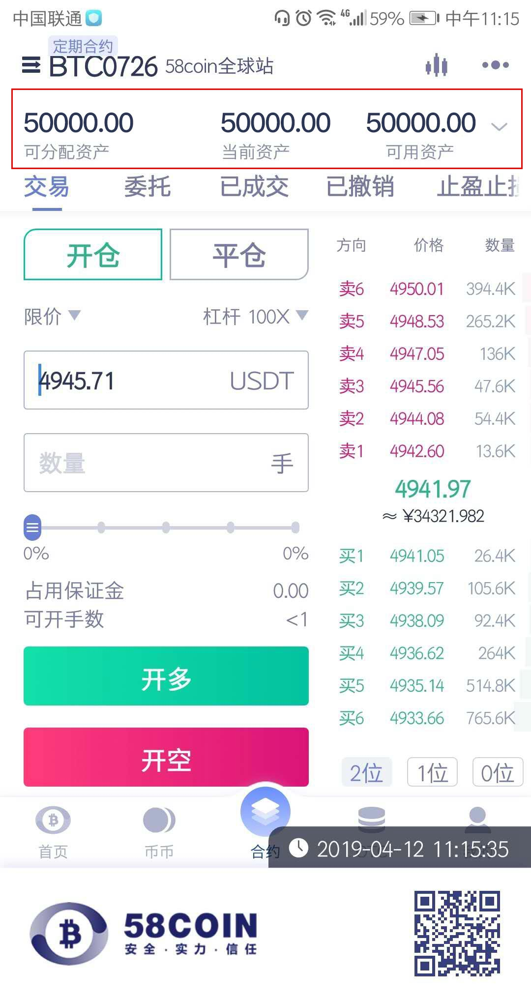 3、资产分配完成后,即可在相应合约币种顶部资产区显示;