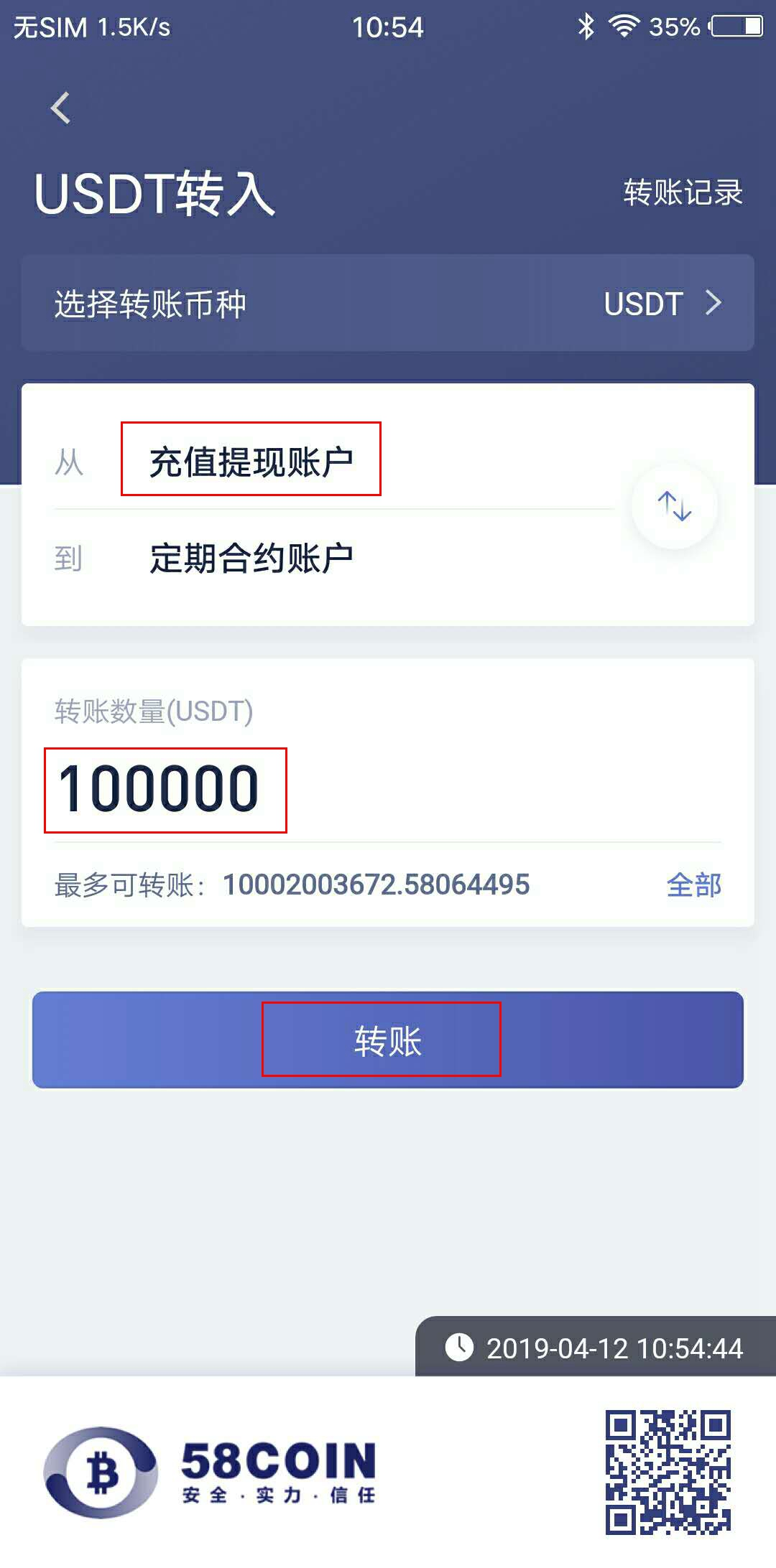 2、进入USDT转入界面后,选择资产转出账户,如充值提现账户,填写“转账数量”,点击“转账”;