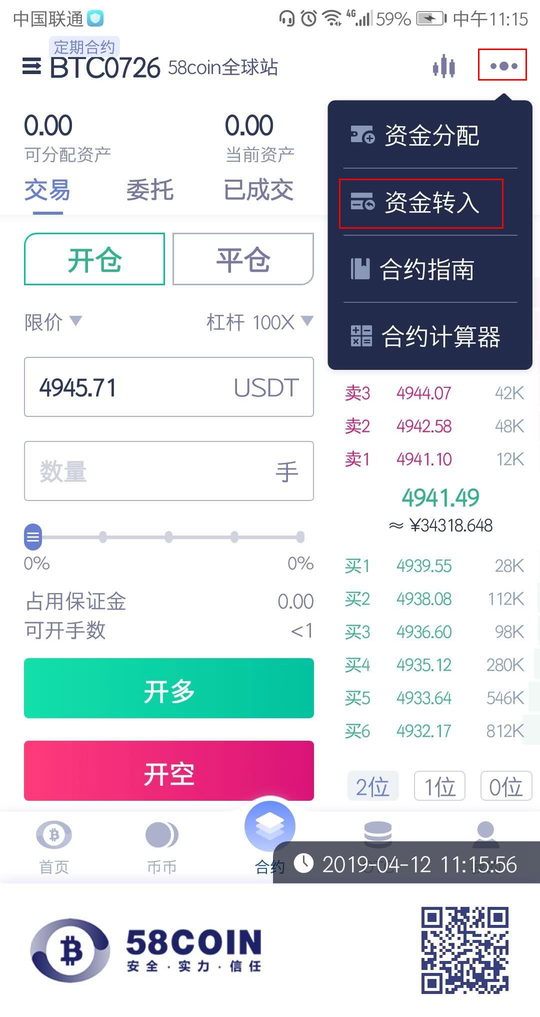 1、APP登陆后进入定期合约界面,点击右上角“...”进行“资金转入”操作;