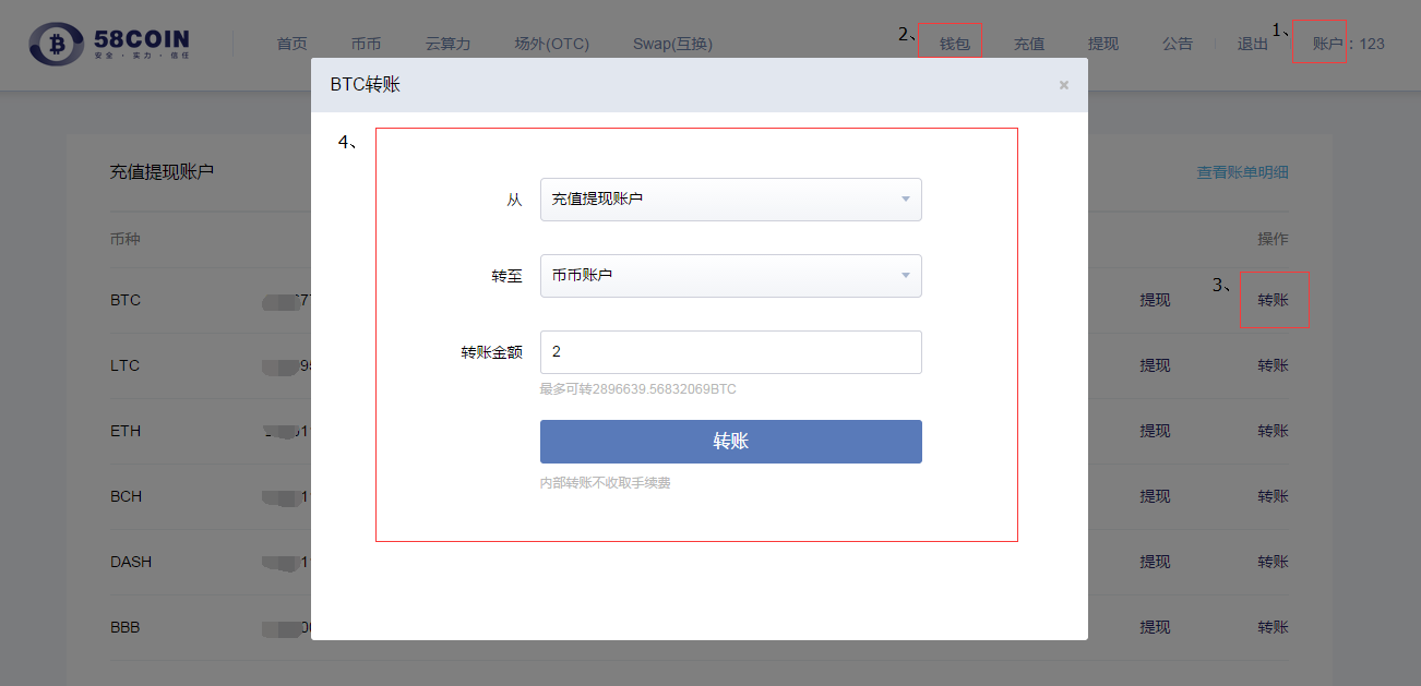 1. 登陆官网www.58coin.com ,点击右上角账户、钱包、转账、从有资产的账户转至币币账户、填写数量、转账即可实现免费划转。