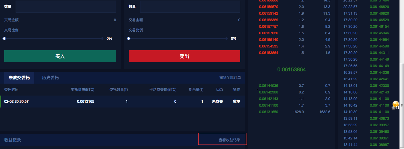 进入交易页面后向下拉可以看到“收益记录”,点击“收益记录”后即可查看您每天算力的收益完成记录了。