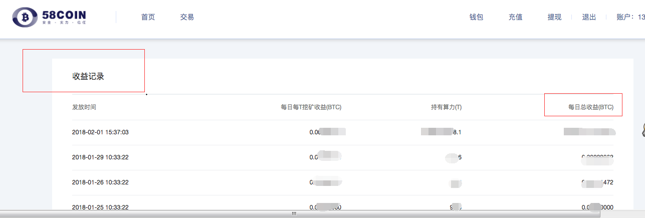 58HASH采用PPS的收益分配模式,根据www.btc.com每T收益进行核算,合约实际产生的净收益为每天挖矿收益扣除管理费、电费后的数字货币收益,扣除电费时币价参考BITFINEX 8点的价格再汇兑成人民币价格,算力收益将以比特币形式发放至用户在58HASH算力交易平台的账户内,收益发放后用户可自由支配使用。