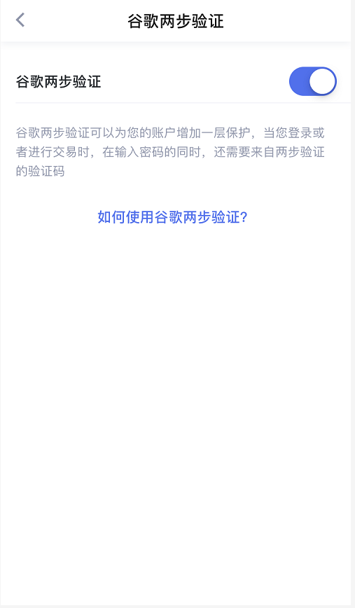 开启谷歌身份验证后,在交易网站进行登录、交易、提现等安全操作时,您除了要输入密码外,还需要输入动态验证码,进行二次确认,这有效地防止了在传统的账号密码被破解或泄露时的账户侵入,账户的安全性大大提升。