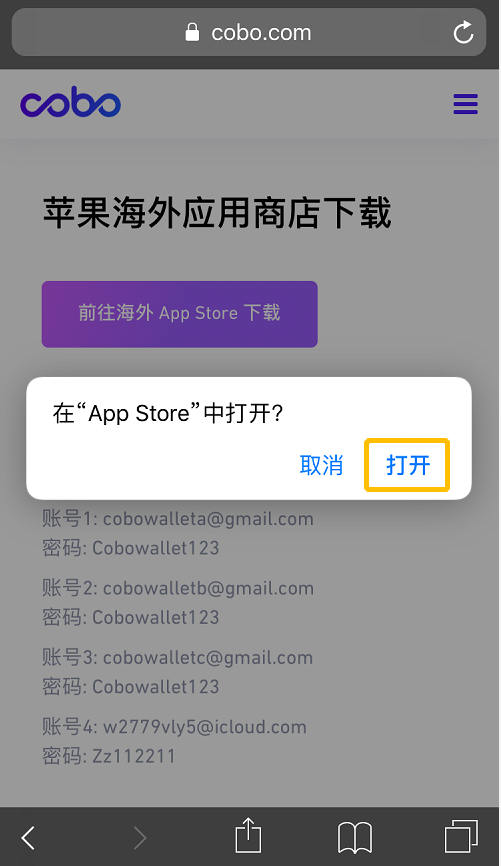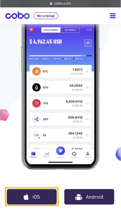 1. 进入浏览器输入网址 cobo.com ——点击「iOS」,前往海外App Store下载;