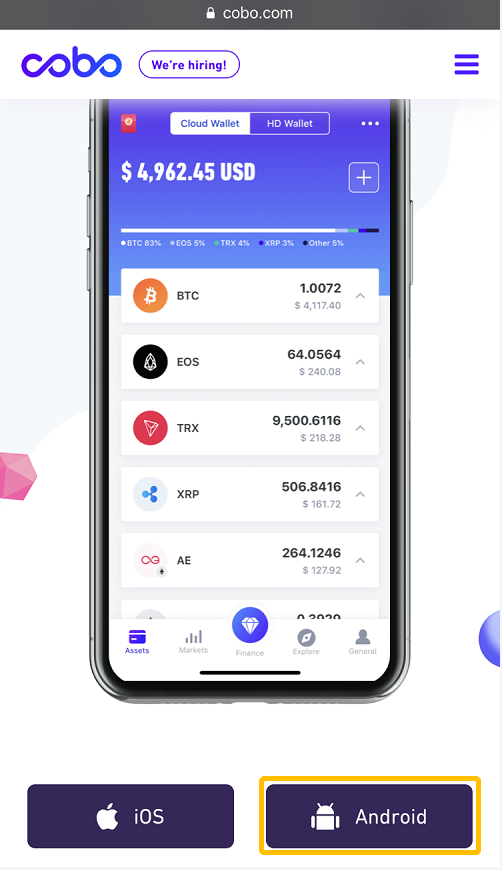1. 进入浏览器输入网址 cobo.com ——点击「Android」,您可以选择跳转至Google Play下载,或下载APK;