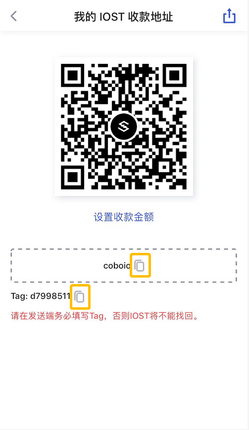 进入IOST账户——点击【接收】,即可获得您的IOST收款地址和Tag;您可以选择二维码收款或复制地址收款。(切记!一定要复制Tag!遗漏Tag会导致丢币!)