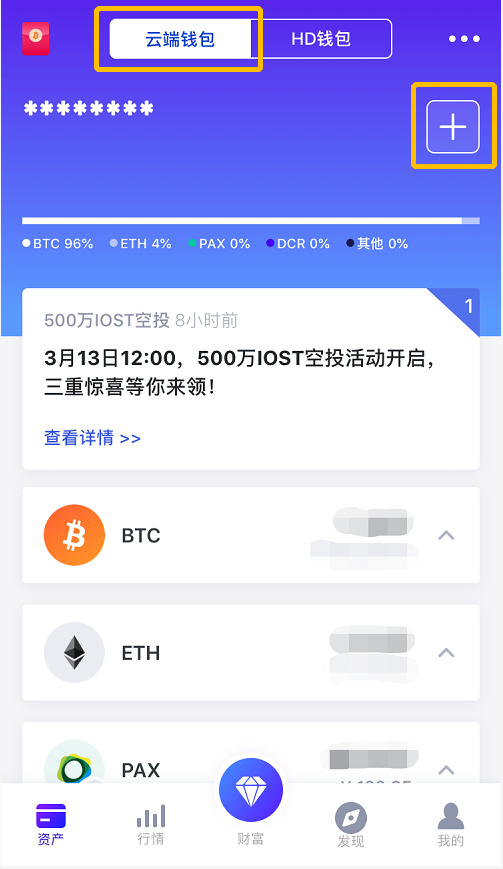 进入【云端钱包】主页——点击【+】号按钮,进入币种搜索页;
