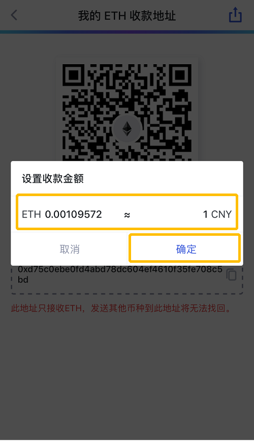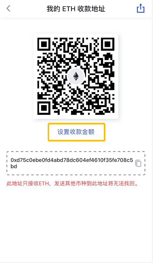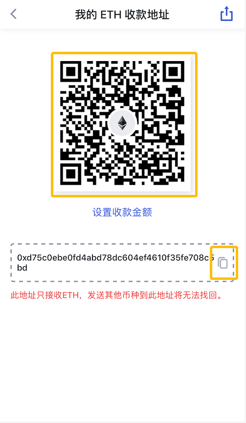 切记:ETH的收币地址只接收ETH,发送其它币种到此地址将无法找回!