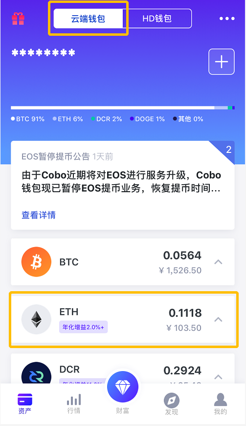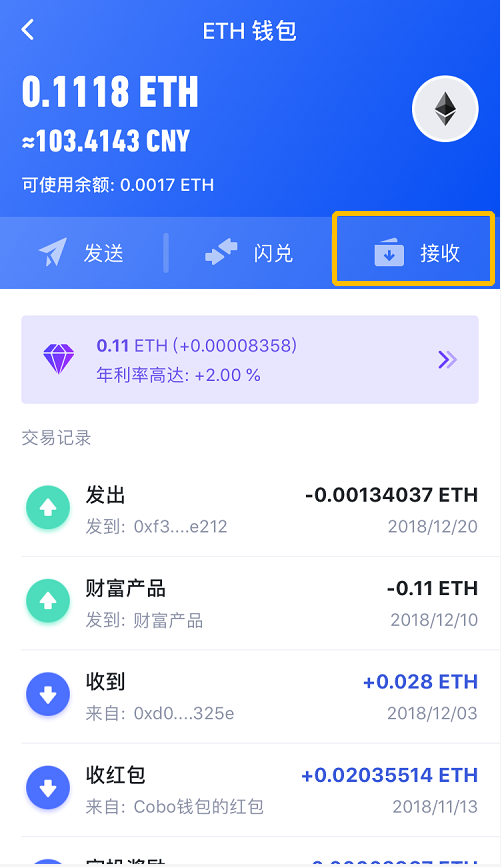 1. (以云端钱包ETH为例)进入云端钱包——点击进入ETH币种页面——点击【接收】;