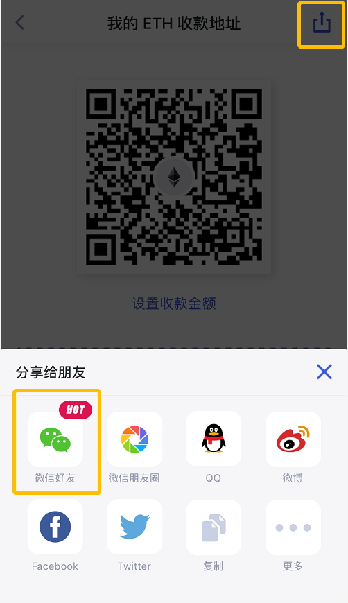 2. 提供要发送至数字货币方的收币地址或者收币二维码,您可点击右上角“分享”按钮将地址信息通过微信或其他渠道分享给发送数字货币方;