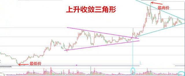 上升收敛三角形是在上升趋势中由一段时期的价格波动所形成,在一定区域的波动幅度逐渐缩小,每次波动的最高价都比前次低,而最低价都比前次高,将这些短期高点和低点分别以直线连接起来,就形成了一个几乎对称的三角形。