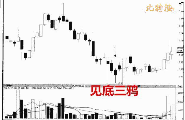 底部三鸦出现在经过一段较长时间和较大幅度下跌后的底部区域,它由倒“山”字形的三根阴线组成,实体的长短应大体相当。其中,第二根k线一般平开或低开。第三根k线一般是向上跳空高开,收盘价在第二根k线的开盘价之上。