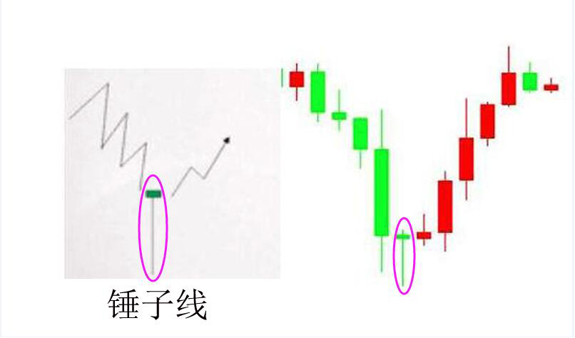 锤子线的定义:下影线长度大于两倍的开盘价收盘价之间长度的K线,且要在下跌趋势中才有意义,是看涨形态。