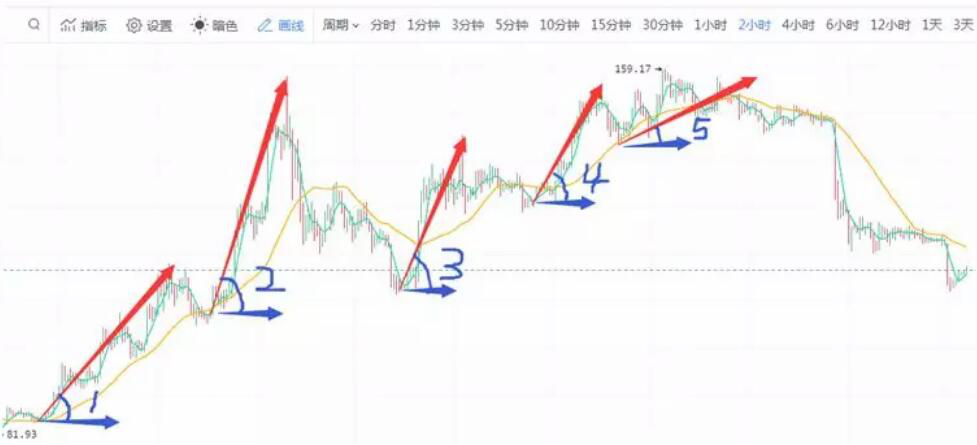 2这里是逐步的小K图,上涨不起来,所以就后面回调了。从3那里看的出来,市场的多军还是有一波挣扎的...然后4处再也扎挣不动,所以就暴跌了。。。
