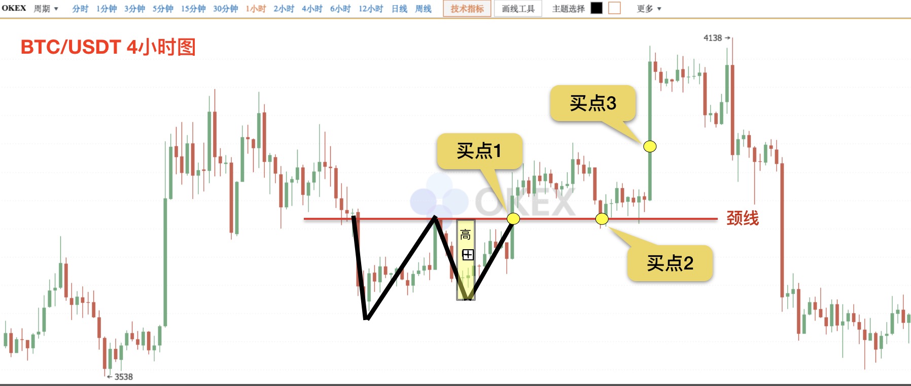 如图,比特币兑USDT的4小时行情图,此次形成W底形态后,出现三次买入机会,如图黄点所示。最终上涨高度,超出预测范围,形成超额利润。