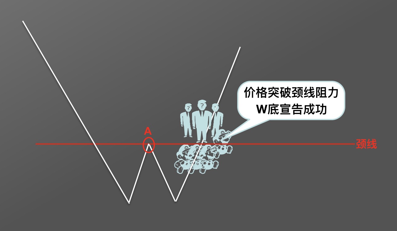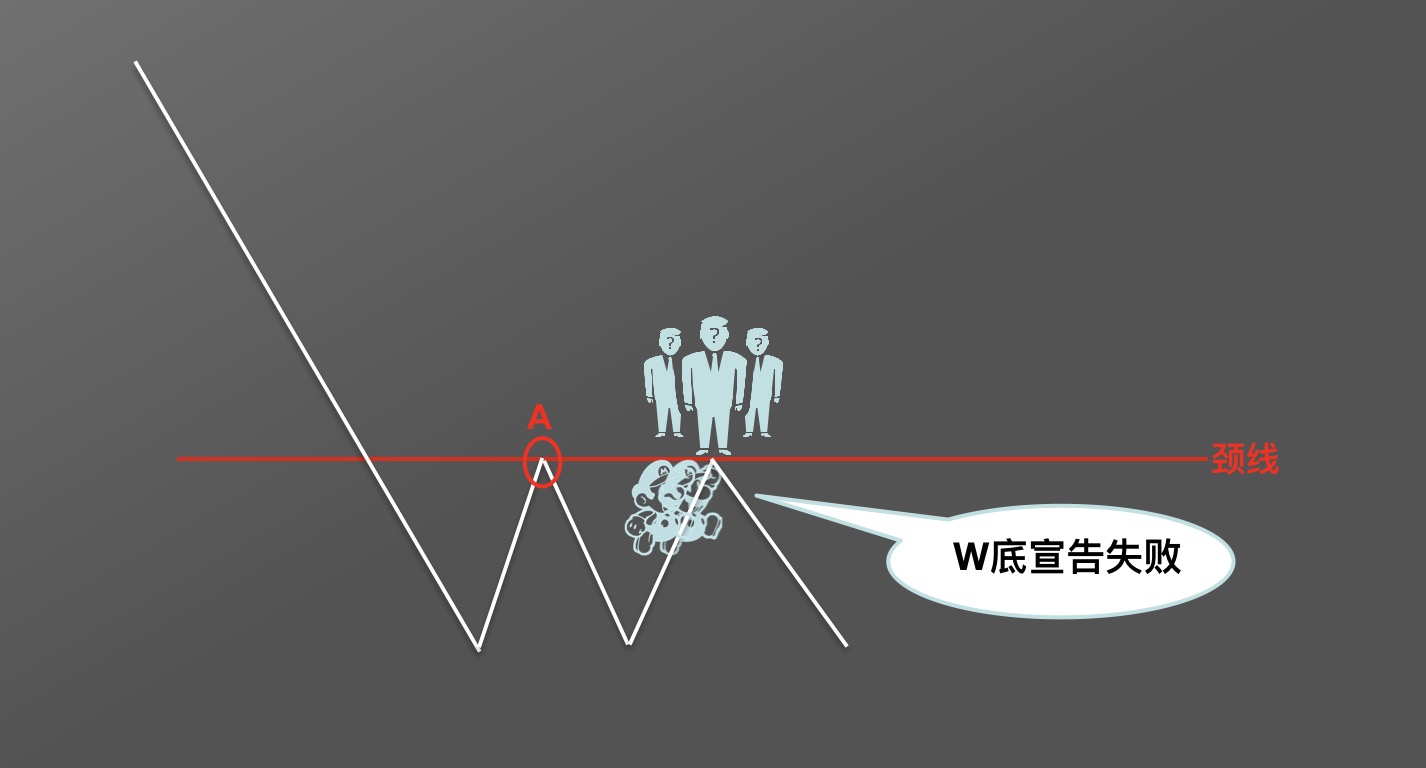 当价格在颈线之下时,颈线为阻力线。市场表现为:颈线所处价格附近,主动买入的投资者人数明显少于准备卖出的投资者人数,这就形成了上涨阻力。市场中迟迟未能出现更多的买入,价格自然无法突破阻力线,便顺势形成下跌。如此,W底形态宣告失败,未能形成。