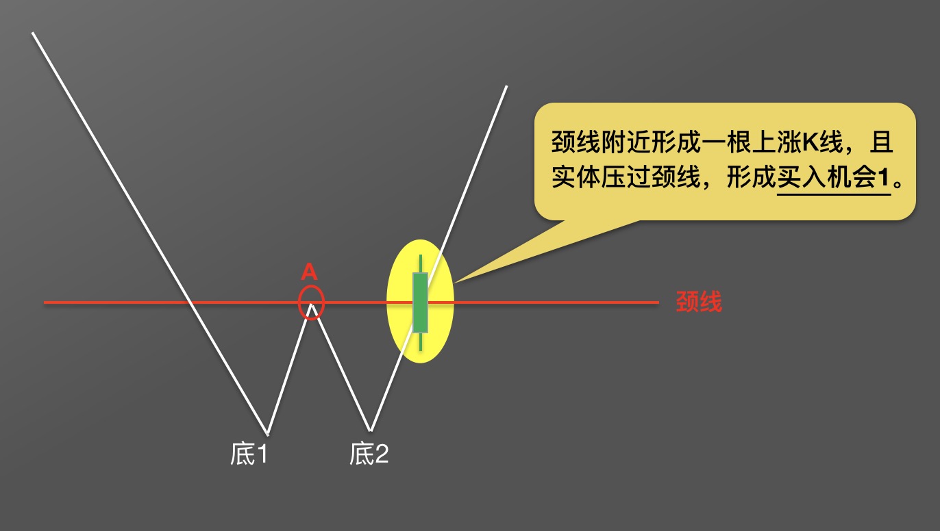 首先,要确认W底形态的结构,并画出重要的多空参照线——颈线。伴着行情的不断变化,我们至多发现三次绝佳的买入机会,分别是破位颈线——买点1、回踩颈线——买点2、突破前高——买点3。
