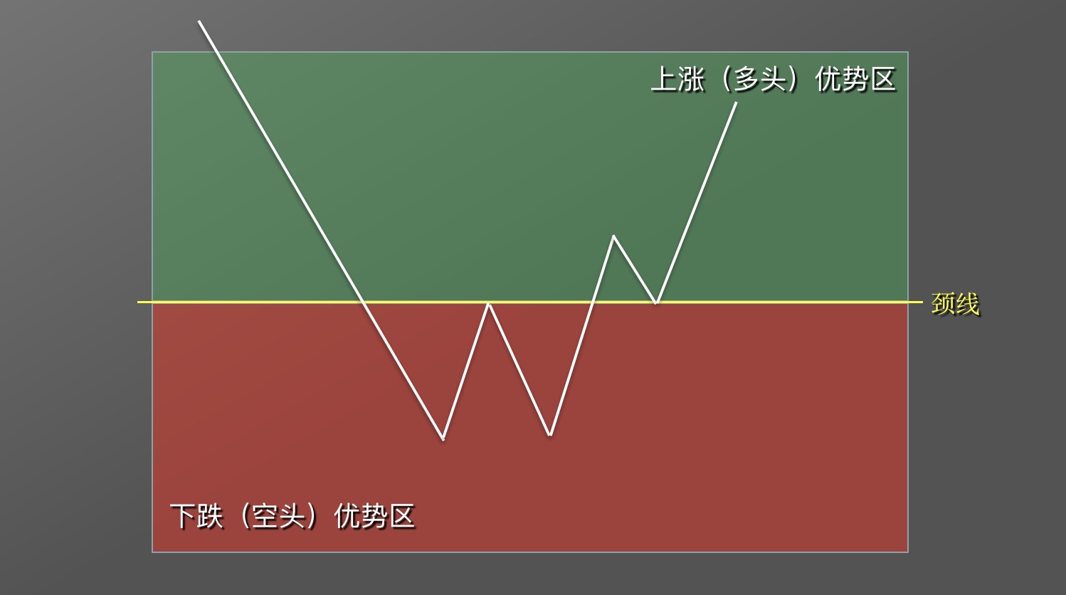颈线之上,为上涨多头优势区,该范围内宜买涨,不宜卖空。①颈线之下,为下跌空头优势区,该范围内宜卖空,不宜买涨。