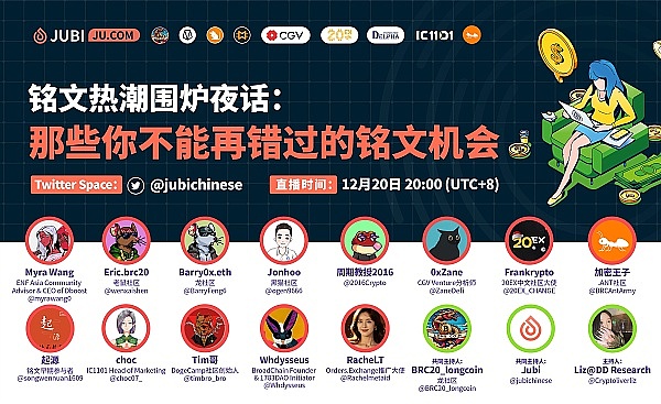 基于铭文相关话题的火热程度和用户的热切关注,12月20日,聚币Jubi中文推特举办主题为【铭文热潮围炉夜话:那些你不能再错过的铭文机会】的Twitter Space活动。本次活动邀请到ENF Asia Community Advisor & CEO of Dboost Myra Wang,老鼠社区Eric.brc20,龙社区Barry0x.eth,黑猫社区Jonhoo,周期教授2016,CGV Venture分析师0xZane,20EX中文社区大使Frankrypto,.ANT社区加密王子,铭文早期参与者起源,IC1101 Head of Marketing choc,DogeCamp社区创始人Tim哥,roadChain Founder & 1783DAO Initiato Whdysseus,Orders.Exchange推广大使Rachel.T等13位行业资深从业者。同时,邀请到来自DD Research的Liz成为本场space的主持人,并且由来自龙社区的BRC20_longcoin担任共同主持人。本次Twitter Space活动热度非常高,吸引了超2.9万人次围观和收听。