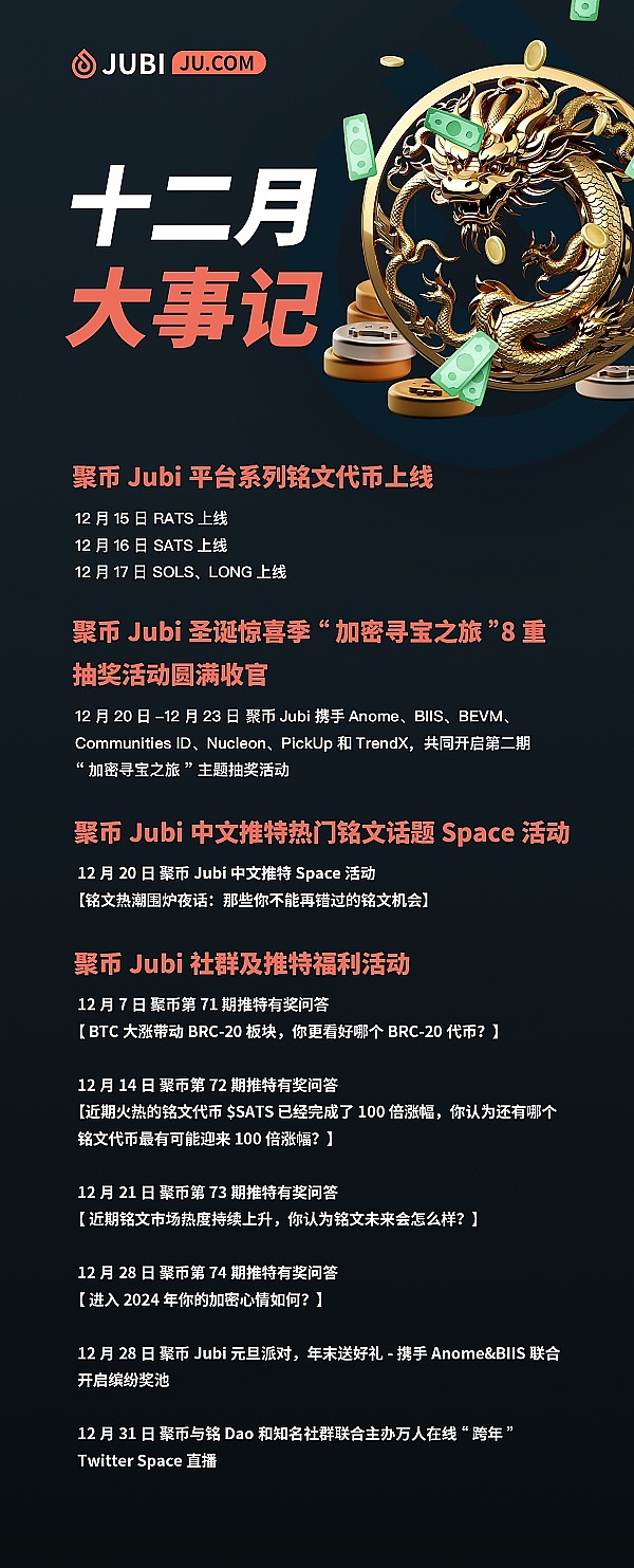 本月,聚币Jubi火热上线多个热门铭文代币。12月10日,聚币平台上线第一个BRC-20铭文代币ORDI,ORDI上线后最高涨幅超68%。12月15日 - 17日,聚币平台连续上线多个铭文代币,含热门铭文代币RATS、SATS、SOLS和LONG。未来,聚币将继续发掘并上线更多优质热门项目代币。