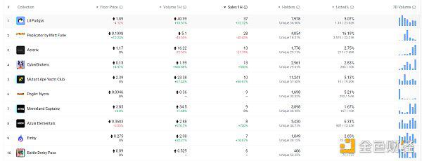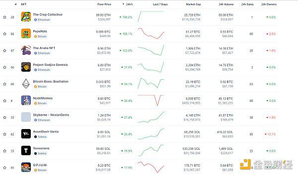 24小时NFT交易量、交易量前十项目 数据来源:Coinmarketcap