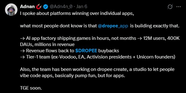 大多数空投项目在早期热潮过后就会销声匿迹,但 Dropee 空投项目却试图打造一个持久的项目。Dropee 的官方 X预计到 2026 年,它将从一个游戏工作室转变为一个由用户拥有的庞大的、人工智能驱动的生态系统。