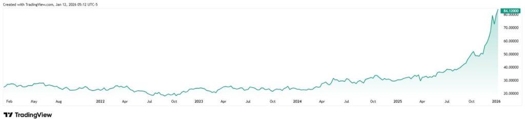 纵观白银近年来的表现,清崎的论证似乎合情合理。这种贵金属在过去五年里上涨了惊人的239%,在过去12个月里也上涨了同样令人瞩目的183%,因此成为2026年最受关注的资产之一。