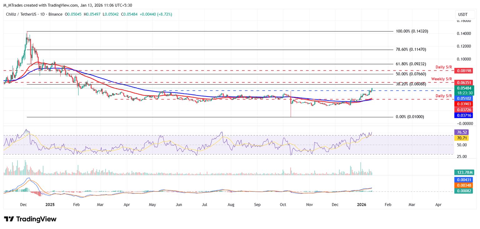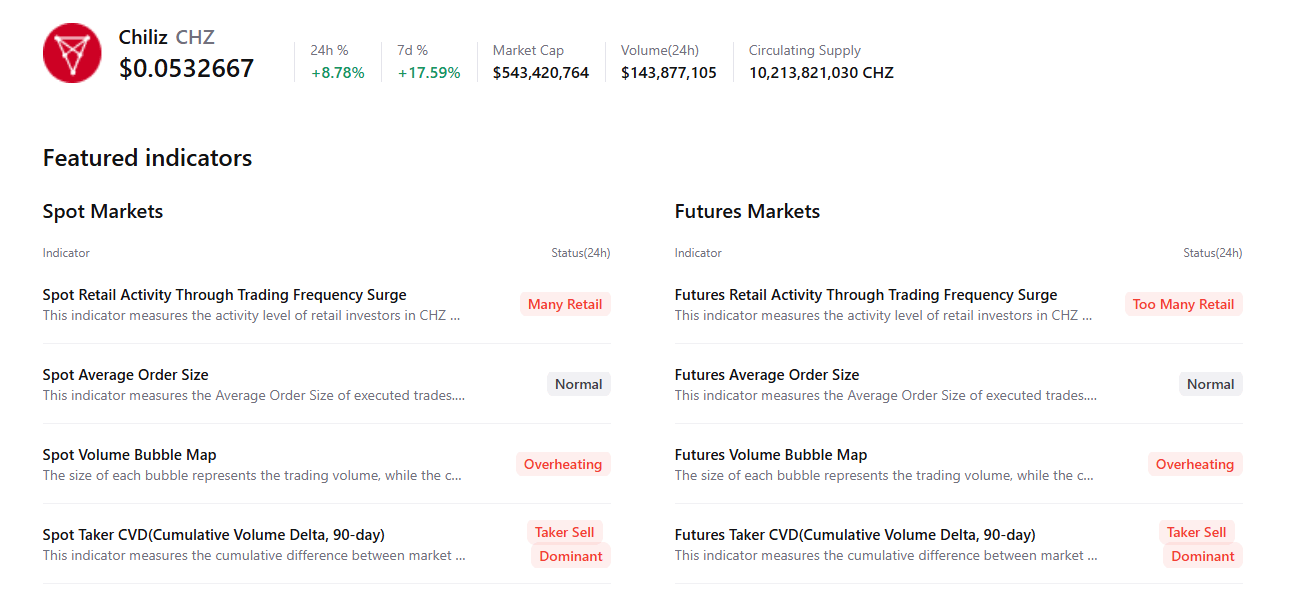 Chiliz (CHZ) 周二上涨 8%,报 0.054 美元,延续了自 12 月中旬以来的涨势。Fan Token 和 Locker Room 等新推出的功能和发展提振了投资者对 CHZ 的需求,推动其市值超过 5.5 亿美元。尽管涨势持续,但交易者仍应保持谨慎,因为链上数据显示存在一些可能限制进一步上涨的预警信号。
