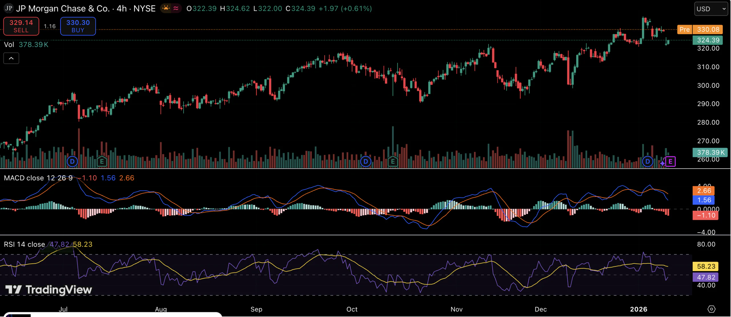 财报发布后,摩根大通股价上涨约2%,接近331美元,进一步逼近近期高点。财报发布后的走势表明,投资者更关注公司盈利能力和未来业绩指引,而非受一次性信贷项目影响而导致的净利润下滑。