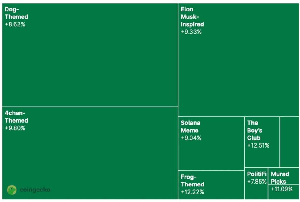本周的股票阵容中,以青蛙为主题的股票无疑是最耀眼的明星。Pepe (PEPE) 表现极其强劲,过去 24 小时内飙升了 10.5%。紧随其后的是 Murad 的几只高信心之选,包括备受追捧的 SPX6900,涨幅达 4.8%。而以狗为主题的股票,例如涨幅达 5.8% 的 DOGE,也同样表现不俗。