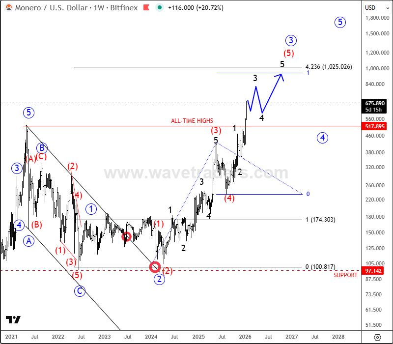 门罗币 (XMRUSD) 目前正强势突破历史新高,符合预期。从月线图来看,价格走势持续表明其仍有巨大的上涨空间。门罗币可能正在展开五浪上涨行情,或者正在突破一个更大的看涨三角形形态。无论哪种情况,技术面都支持更高的价格,并且距离预期的三角形目标区域仍有充足的空间。