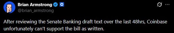 本周早些时候,Coinbase首席执行官布莱恩·阿姆斯特朗他公开撤回了对《CLARITY法案》的支持,称该草案是“糟糕的法案”。他表示,他宁愿没有法律,也不愿有有害的法律,并指责银行保护过时的商业模式。