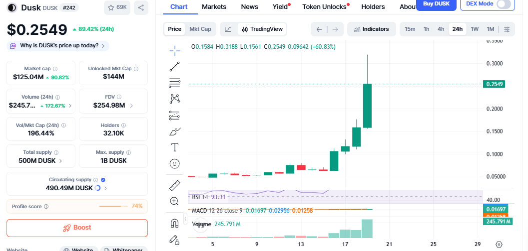 TDUSK 的价格飙升成为本周加密货币市场最大的惊喜之一。尽管整体市场下跌超过 2%,DUSK 在过去 24 小时内上涨超过 100%,一周内涨幅超过 300%。
