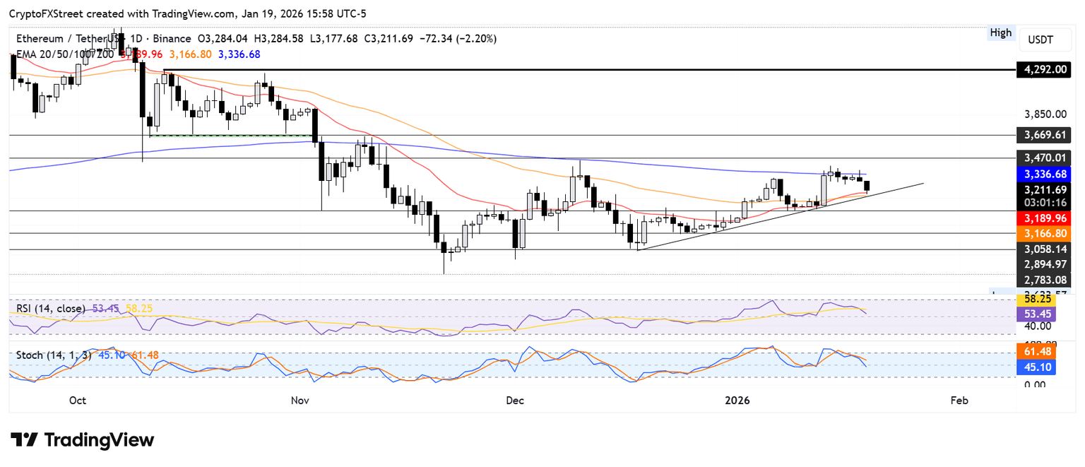 以太坊价格在12月18日以来的上升趋势线附近反弹,该趋势线靠近20日和50日指数移动平均线(EMA)。如果跌破该趋势线,以太坊价格可能在3050美元附近找到支撑。另一方面,如果以太坊价格能够维持在该趋势线附近的反弹势头,则可能挑战200日EMA。