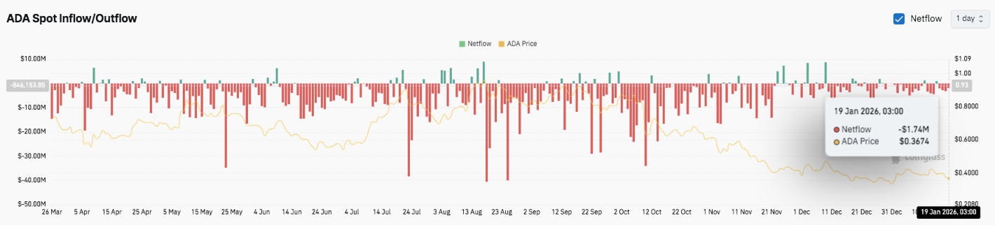 第一个支撑区域位于 0.364 美元至 0.355 美元之间,该区域与跌破区域和关键斐波那契回调位重合。如果该区域失守,ADA 可能下滑至下一个主要底部附近,即 0.328 美元至 0.330 美元。该价位反映了此前的低点和较强的需求区域。因此,交易员目前将 0.355 美元和 0.330 美元视为重要的下行阻力位。