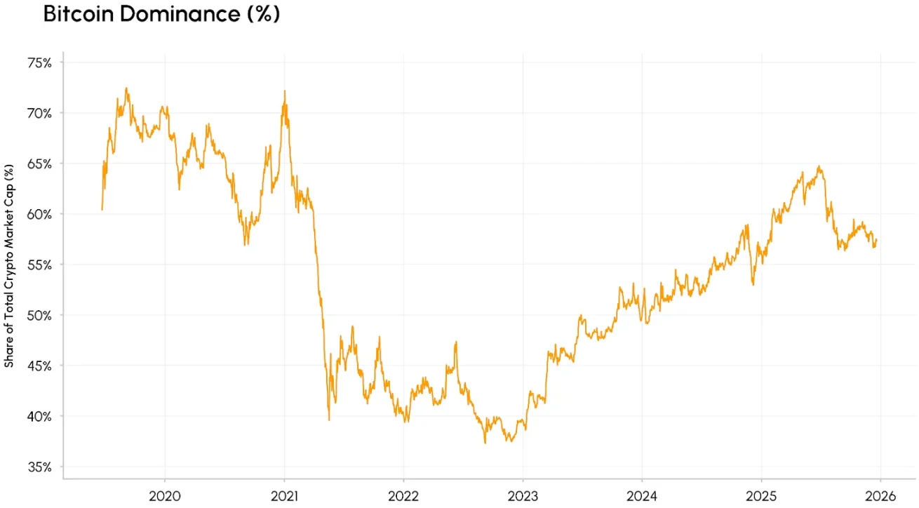 比特币现货 ETF 的推出推动了机构化进程的深化,为其吸引了超 1500 亿美元的长期资本,这进一步助推了其市值主导率的持续走高。这一趋势巩固了比特币在加密市场中的 「避险资产」 定位,也使其成为传统机构投资者进入加密市场的高流动性、规范化入口。相较于此前几轮牛市中 「山寨季」 快速稀释比特币市值占比的情况,本轮比特币的主导地位更具持久性。