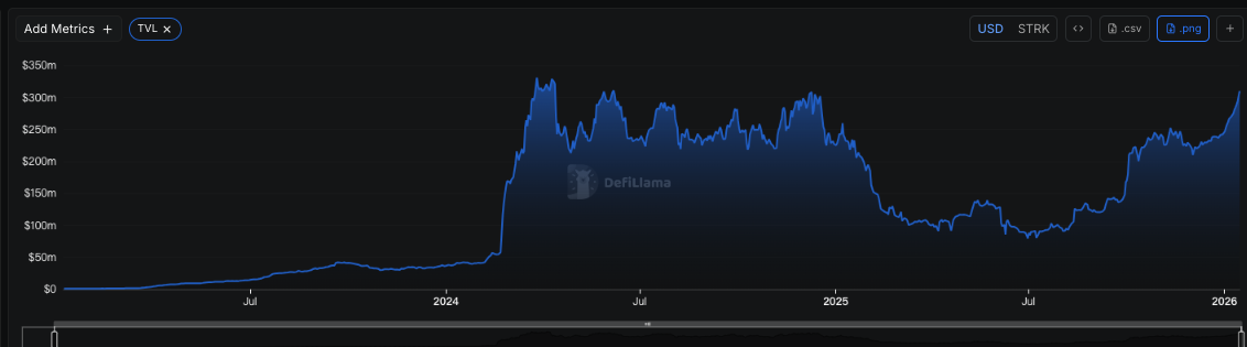 但经过一年多时间的卧薪尝胆,Starknet 现在已经能和大多数 L1 掰掰手腕。据 DeFiLlama 数据,Starknet 的 TVL 自 2025 年 9 月开始回升,目前已超 3 亿美元,回到了 2024 年的水平。在区块链排名上位列第 22,超过了 Monad、Scroll、Linea、Sei 等一众 L1 和 L2。