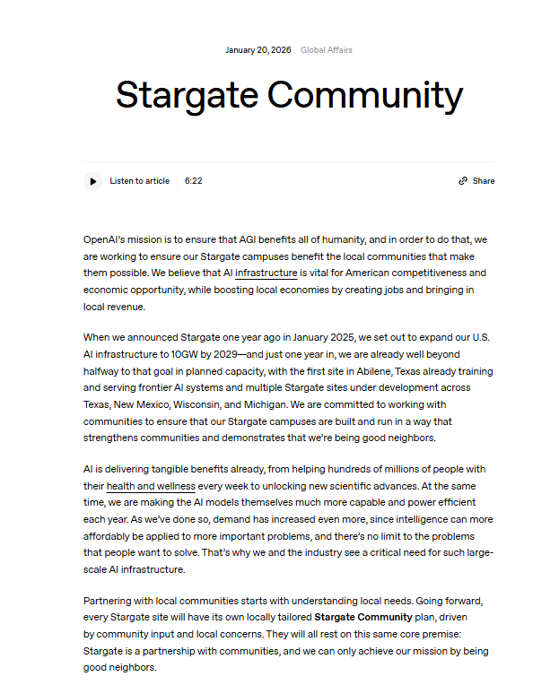 这家ChatGPT制造商表示,将与项目所在社区合作,根据当地需求定制方案,包括支付额外的电网基础设施费用或自行确保能源供应。星际之门是一项价值5000亿美元的多年期AI基础设施建设计划,由OpenAI及其合作伙伴软银和甲骨文公司共同推进。