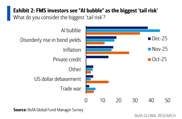 1月21日,据追风交易台消息,美银在最新的研报中称,虽然AI是一场根本性的技术革命,但估值过高和时间周期的不确定性已成为不可忽视的风险。38%的基金经理现在将“AI泡沫”视为最大的尾部风险。