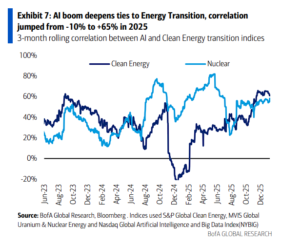 然而,研报称,市场正在迅速意识到这种联系。清洁能源与AI的相关性在一年内从-10%飙升至65%。