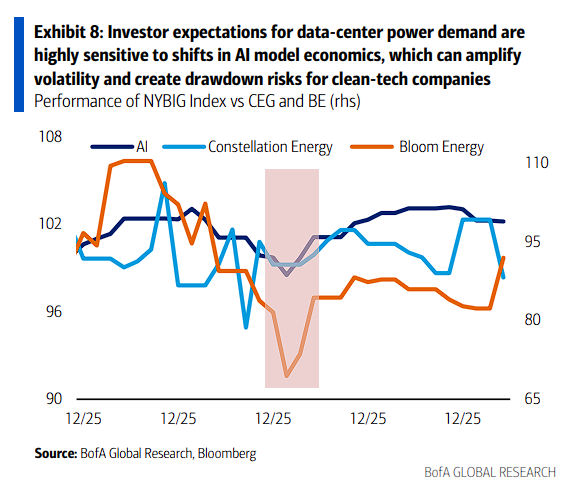 电力生产商股票在2025年12月的疲软表现,反映了市场对AI泡沫的担忧正在向清洁能源领域蔓延。投资者担心数据中心可能绕过独立发电商,转向垂直整合的公用事业公司或自建电厂。