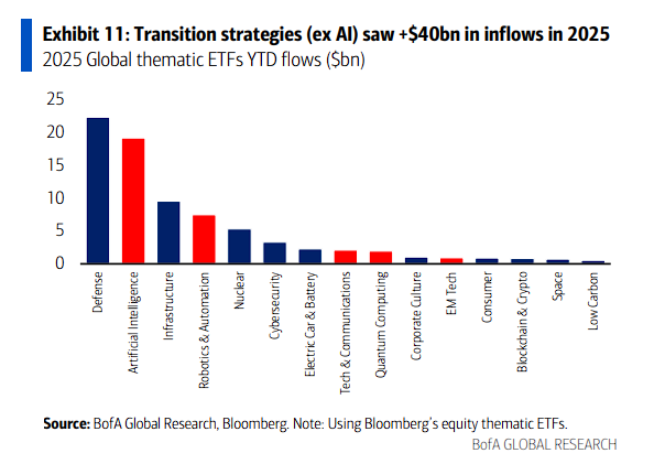 研报称,即便AI热潮冷却,电网升级和国防开支的刚性需求依然存在。事实上,剔除AI后的转型策略在2025年已吸引了超过400亿美元的资金流入。